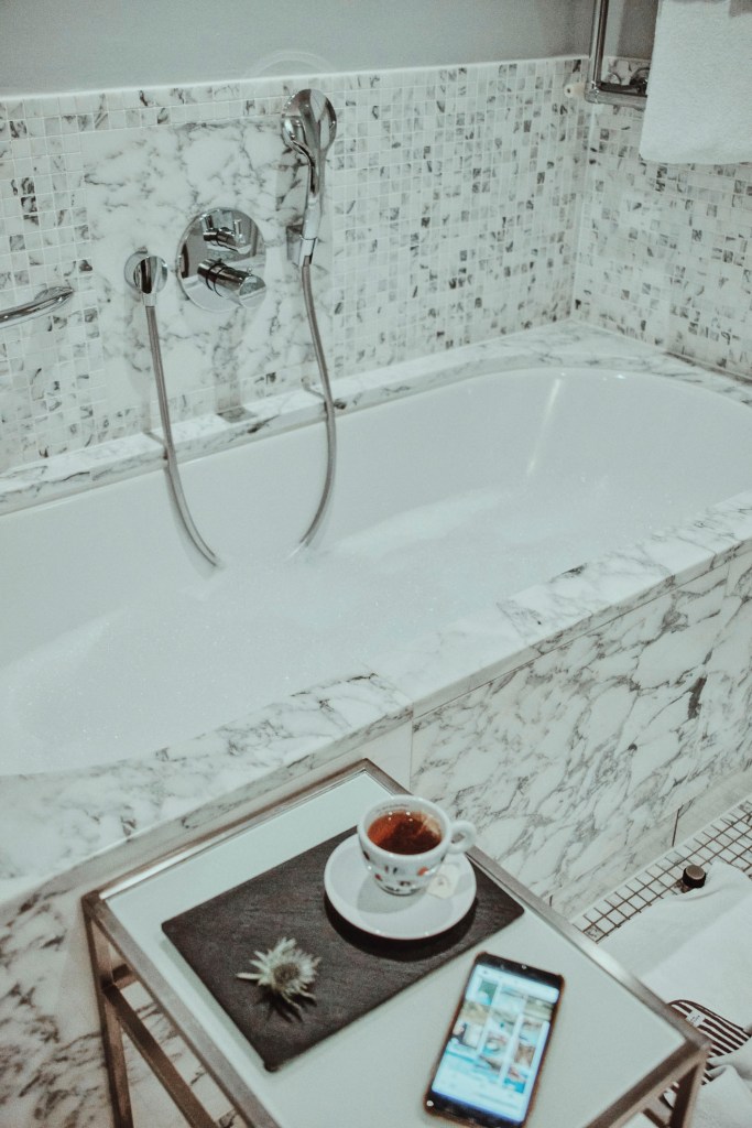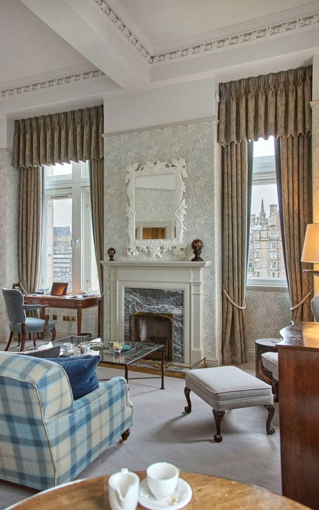 We enter into a sunny, bright suite, and what immediately fills the senses is being surrounded, quite literally, by Edinburgh, in every direction. Scott Monument is looming brilliantly from every easterly window. Princes Street and its famous shops are right below as well. And of course: Edinburgh Castle is slightly in the distance, just on the other side of Waverley Station and the Princes Street gardens (it is a castle view suite, after all). If that wasn’t enough, beautiful medieval Old Town herself is on either side of the stone fireplace. You can even see Arthur’s Seat. The Balmoral is the only hotel in Edinburgh where you get a clear view of it.