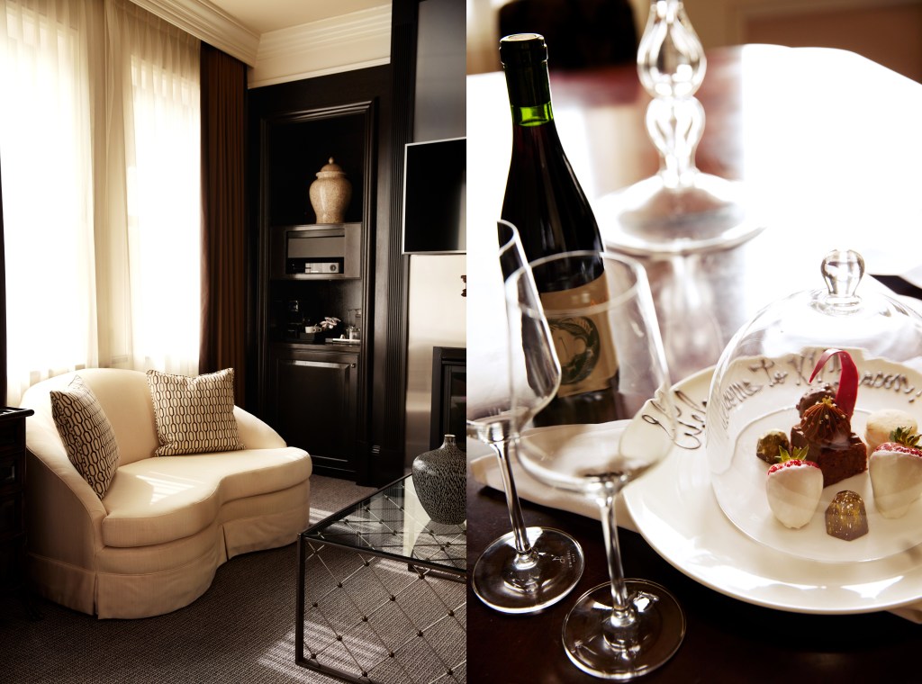 Red wine and chocolates await us. The wine will have to wait for later, it’s only 11:30a; so we relax in front of the bedroom suite’s fireplace and have chocolate for brunch. We wander up to the rooftop deck next for a great view of the city, and consider using the gym …. but nah. That can wait.