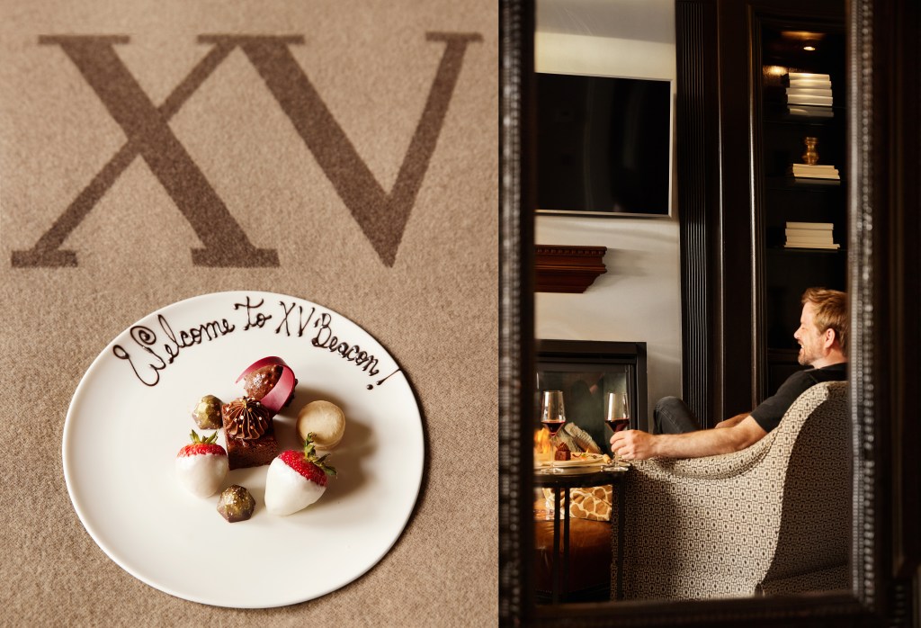 We check-in early on an October Sunday into the XV Beacon. Our home for the next 25 hours in Boston, Massachusetts, is one of the 5-star luxury hotel’s beautiful Bromfield Suites, a 970 SQ FT one bedroom suite. It’s an impressively sprawling space, overlooking pretty Bostonian rooftops and streets; complete with a studio bedroom with a cosy sitting area in front of a fireplace, and a separate parlor living room with a second fireplace and dining table, as well as two closets and two full bathrooms with jetted tubs.
