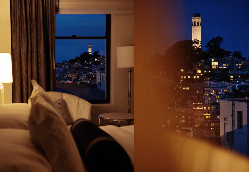 -The San Francisco suite with corner views to the north overlooking Coit Tower on Telegraph Hill, Fisherman’s Wharf, Alcatraz, and to the east toward California Street and the Bay Bridge and…